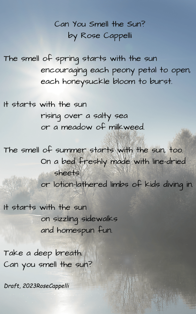 Rose, I am sorry that I arrived so late. It is hard to believe that one week of time so much happened in our family, a birth and death. Your poem is uplifting and that is what I need on this VERY long ride to Central NY for my Uncle’s funeral. Your topic, smelling the sun, is unique. I am going to pause right now to smell the sun!