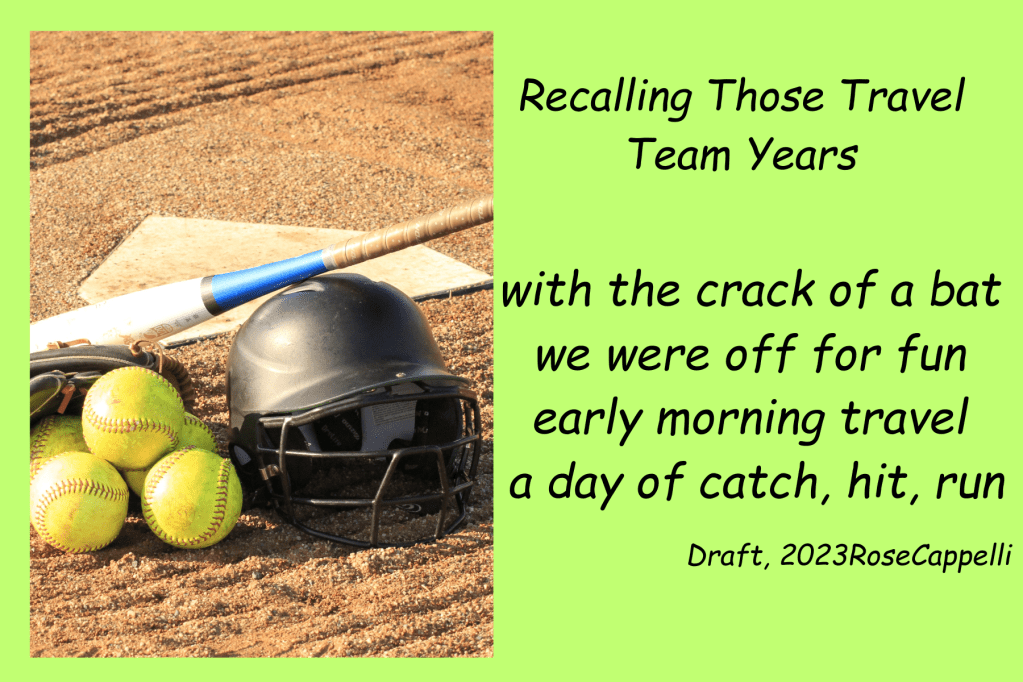 Rose, your “crack of a bat” immediately hooked me. I can hear the “crack,” and hear your daughter and you “getting to know each other better.” Beautiful memories in your poem; lovely rhythm, and rhyme encircle it. I love your poem and can relate to it with soccer travels with our oldest and music travels with our youngest. Thank you for sharing your inspiration, joy and reminding me of beautiful memories with my own daughters. I second your thank you to MO. 🙂