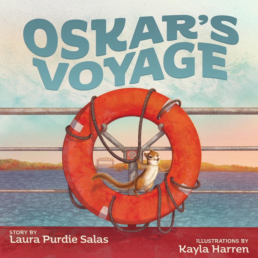But when my preordered copy of Oskar’s Voyage arrived this week, I knew I had to celebrate, especially because Laura Purdie Salas is our host today. Oskar’s Voyage is a delightful story by Laura and illustrator Kayla Harren about an endearing chipmunk whose love of tomatoes causes him to become a stowaway on a Great Lakes freighter. It is full of fun, facts, and lots of emotion. And what better way to celebrate than with a poetryaction. A poetryaction is a poem written in reaction to a book, and Laura has lots of examples on her website. I borrowed one of Laura’s lines “takes a giant flying leap” for mine.