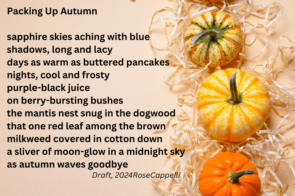 Inspired to write a list poem about autumn, I reread my daily (almost) snippets for the last few months to recall some of the wonders of autumn I noticed and what I might pack away to remember.